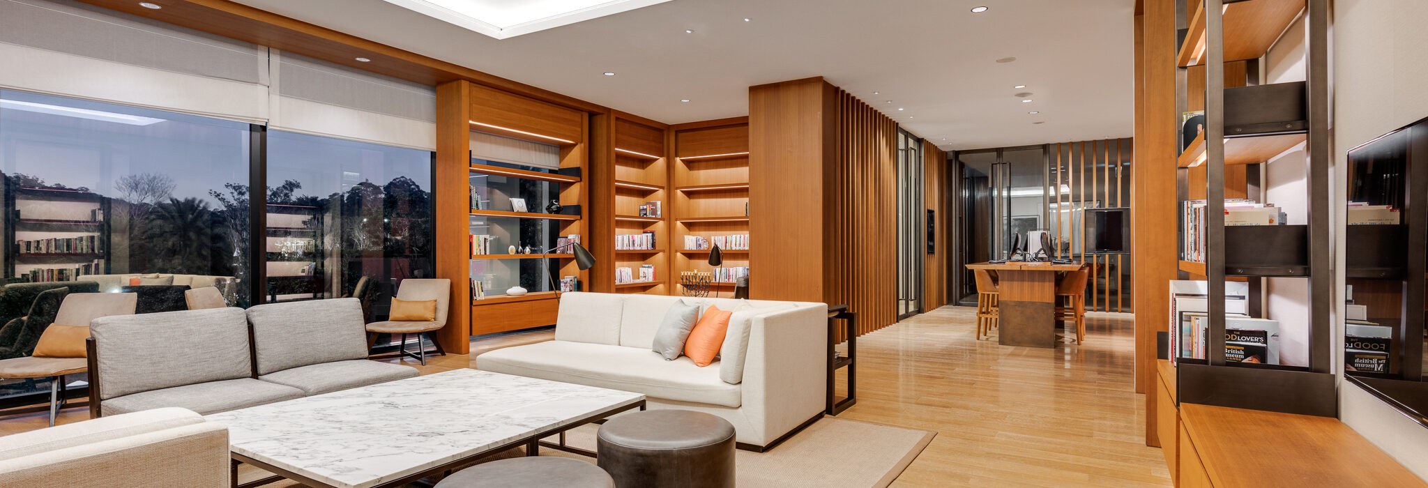 簡約現代風格設計的空間,營造摩登時髦的舒適氛圍,寬敞休憩區域、完善商務設備,近千冊優質藏書,24 小時開放使用,賓客得以在旅行期間仍能輕鬆維持高工作效率。