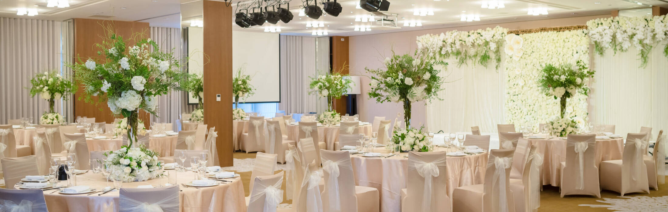 酒店囊括 7 間多功能時尚宴會廳,其中豪華宴會廳擁有挑高 5 米的空間,最多可容納 300 位賓客,無論大型商務研討會、結婚喜宴或企業尾牙春酒,都是完美首選。專業的服務團隊及廚藝團隊,提供殷勤備至的服務,引領新人締造時尚尊榮的回憶!