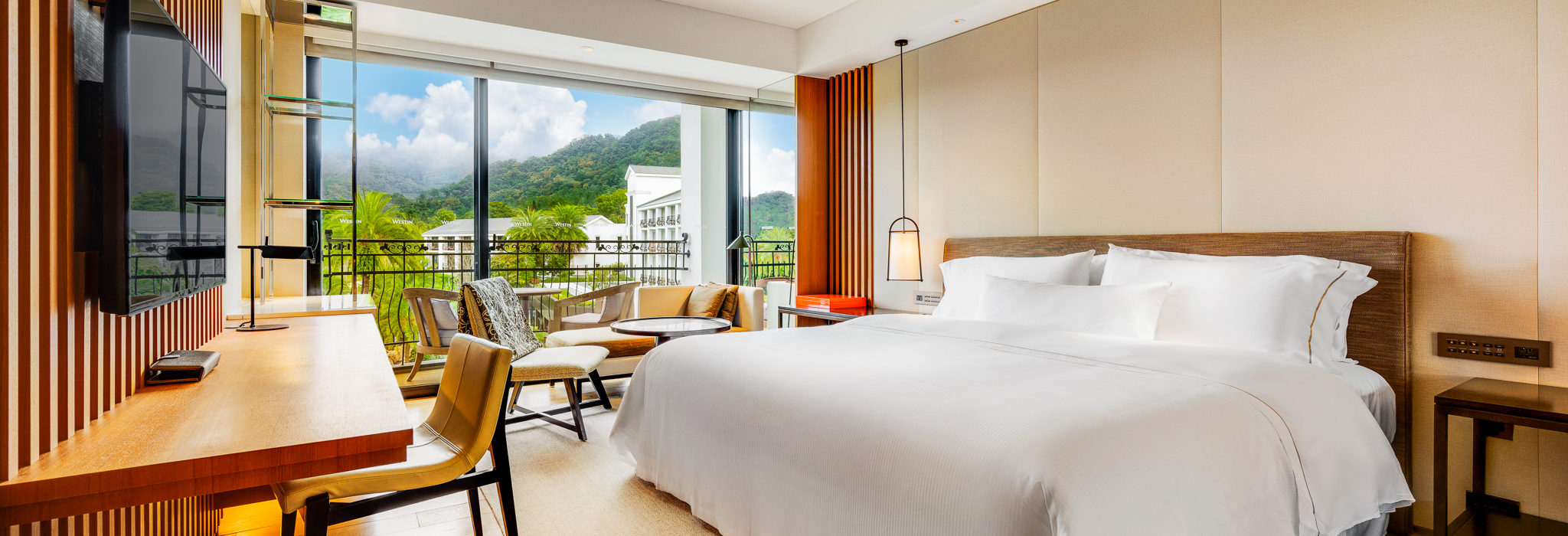 享受 38 平方米的雅緻空間,感受時尚雅致的住宿氛圍,擁有遼闊環山綠意的私人獨立觀景陽台,房內配備聞名於世的天夢之床,設有大理石衛浴含浴缸及獨立淋浴間、免費 Mini Bar。